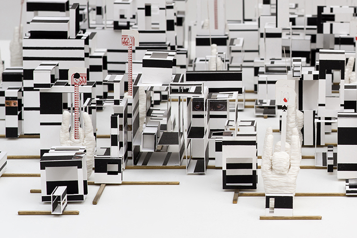 Les minuscules installations, minutieusement réalisées par l’artiste à une échelle nettement plus petite que les maquettes architecturales standard, présentent un ensemble parfaitement homogène de groupes d’éléments itératifs, qui renvoient à la densité et l’opacité des florissantes métropoles urbaines ou bien encore à des circuits électroniques ou numériques sophistiqués développés dans le volume. Elles sont dans le même temps frappantes par leur évidente fragilité. Cette mini-ville dont l’artiste parle avec humour comme d’une « ville code-barre » est construite avec de petits morceaux taillés dans des cartes à jouer et arrimées sur des bustes humains fantomatiques brandissant les numéros des cartes. Dans une autre installation de ce type, une série de chiffres sont alignés sur des tiges horizontales autonomes qui évoquent un décompte, un défilé vers quelle fin ? La métaphore est claire.