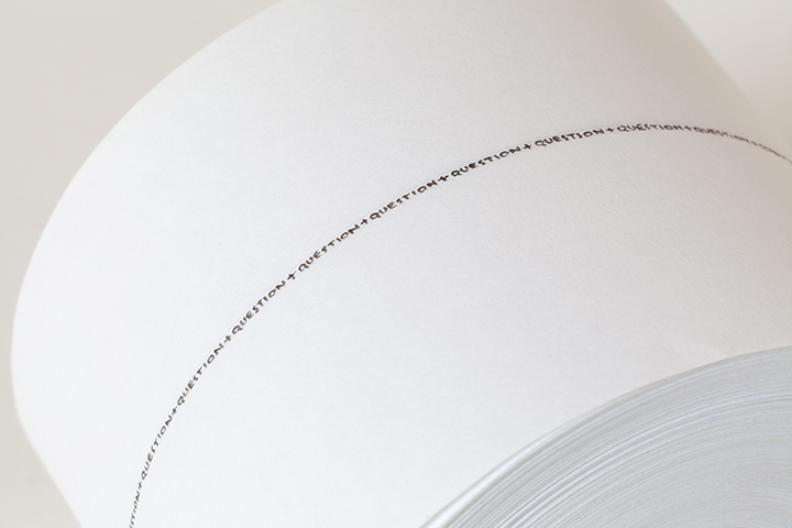 It contains the single word “question” punctuated by the plus sign, repeated all along the line. Questions, always questions. An end without an end, a loop within a loop. An infinitesimal infinity. A slight metaphysical incursion.